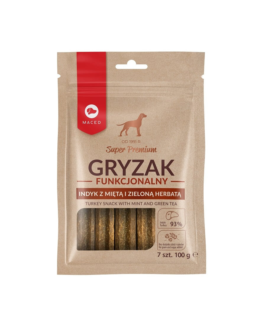 Il masticatore funzionale con menta e tè verde è un prodotto monoproteico che aiuta a mantenere denti e gengive puliti e sani. Il masticatore aiuta a proteggere i denti dall'accumulo di tartaro e fornisce anche calcio, essenziale per la formazione di ossa e denti. L'aggiunta di menta e tè verde ha un effetto antisettico e aiuta a eliminare l'alito cattivo. Con un solo tipo di carne, il bocconcino è indicato per i cani allergici a proteine diverse dal tacchino.