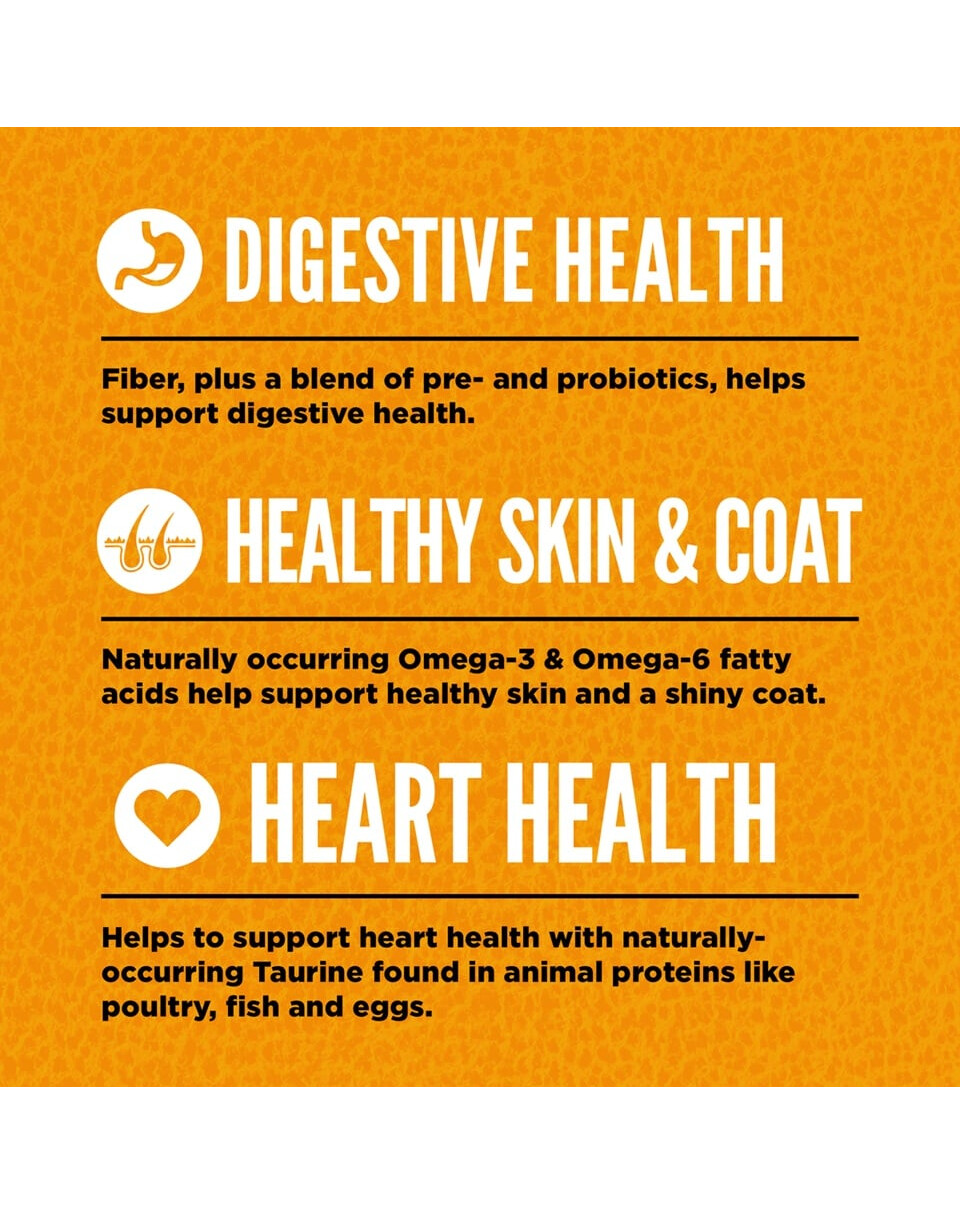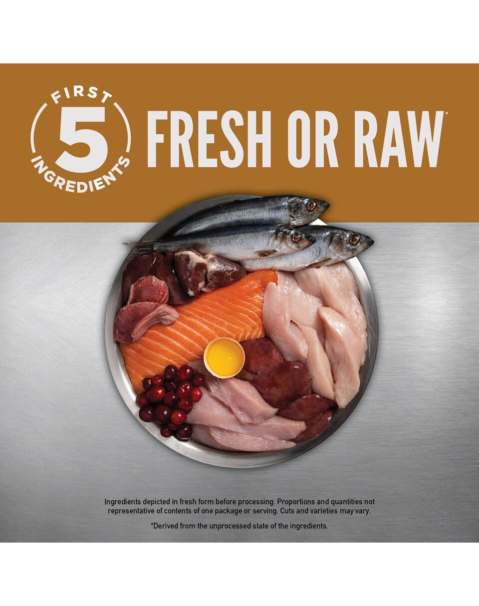 carne fresca di pollo (18%), carne fresca di tacchino (7%), uova fresche intere (5%), fegato fresco di pollo (5%), platessa fresca intera (4%), aringa fresca intera (4%), fegato fresco di tacchino (4%), cuore fresco di pollo (4%), cuore fresco di tacchino (4%), collo fresco di pollo (4%), pollo (disidratato, 4%), tacchino (disidratato, 4%), sgombri interi (disidratati, 4%), sardine intere (disidratate, 4%), aringhe intere (disidratate, 4%), grasso di pollo (3%), lenticchie rosse intere, piselli verdi interi, lenticchie verdi intere, ceci interi, piselli gialli interi, fibra di lenticchie, fagioli pinto interi, fagioli bianchi interi, cartilagine di pollo (disidratata, 1%), olio di aringa (1%), fegato di pollo (liofilizzato), fegato di tacchino (liofilizzato), zucca fresca intera, melone fresco intero, zucchine fresche intere, pastinaca fresca intera, carote fresche, mele rosse fresche intere, pere bartlett fresche intere, cavolo fresco, spinaci freschi, foglie di barbabietola fresche, foglie di rapa fresche, alghe brune, mirtilli interi, mirtilli interi, bacche di saskatoon intere, radice di cicoria, curcuma, cardo mariano, radice di bardana, fiori di lavanda, radice di valeriana, rosa canina. Additivi nutrizionali: zinco, rame, colina.
