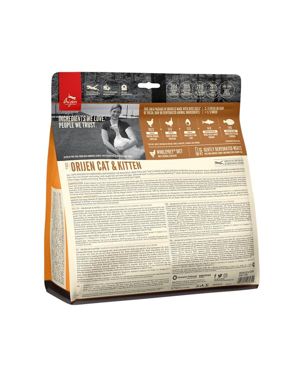 La formula innovativa creata dagli specialisti Orijen si basa su prodotti animali ricchi di proteine. Orijen Cat & Kitten è un alimento composto per l'85% da ingredienti a base di carne. Tra questi vi sono carni fresche e intere di pollo, tacchino - i loro fegati - e pesci interi e freschi come la platessa e l'aringa. Sono integrati con cuori di tacchino e di pollo. Il restante 15% della composizione è costituito da frutta e verdura selezionate per ottenere la massima dose di vitamine e sostanze complementari - carote, mele rosse, barbabietole, mirtilli rossi, zucca in due varietà, pere e mirtilli. Un aroma specifico è dato dalla presenza di lavanda e rosa canina. L'alimento ha un carattere universale, cioè è adatto ai gatti che trascorrono la maggior parte del tempo in casa e a quelli che conducono uno stile di vita attivo. Orijen non contiene cereali, il che è ancora più efficace per aumentare le riserve energetiche della vita quotidiana.