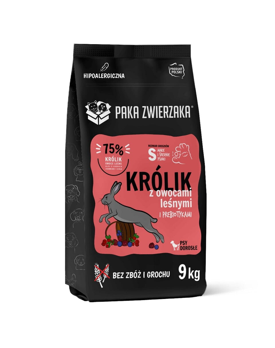 Coniglio e frutti di bosco 36% (inclusa carne di coniglio essiccata 32%, frutti di bosco - lamponi, mirtilli, mirtilli rossi 4%), patate 19%, amido di patate, erbe 9% (semi di lino, cardo, cicoria, ortica, castagno), olio di salmone 11%, polpa di barbabietola, lievito di birra essiccato, minerali e vitamine, prezzemolo, cozze della Nuova Zelanda, MOS, glucosamina, condroitina.
