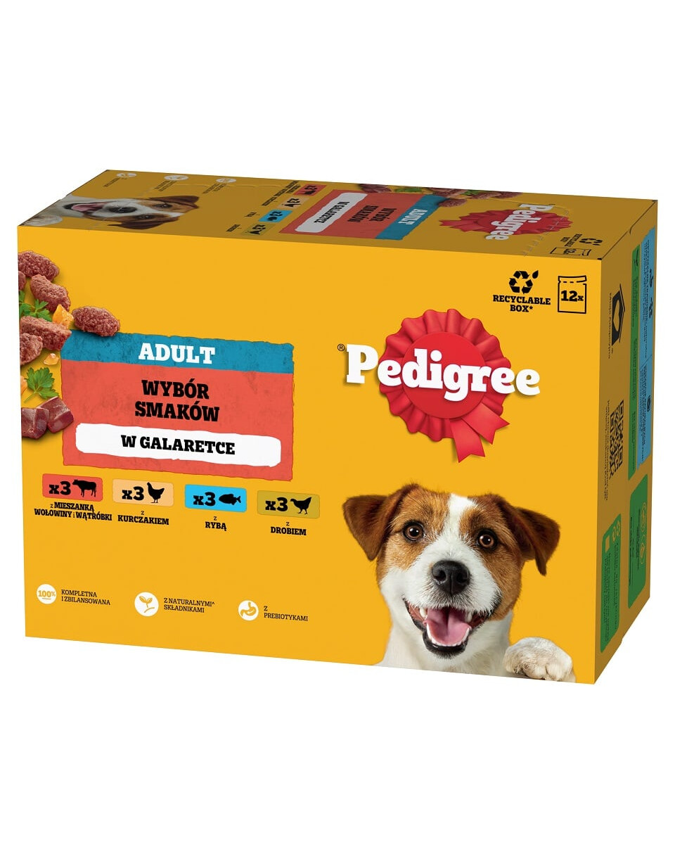Mangime umido PEDIGREE Adult Scelte di Gusto in gelatina aromatica è un alimento completo destinato ai cani adulti. Il tuo cane apprezzerà quattro deliziosi gusti: con mix di manzo e fegato, con pollo, con pesce, con pollame. La ricetta è stata sviluppata da veterinari e specialisti in nutrizione dell'Istituto di Scienza degli Animali WALTHAM. Contiene vitamina E e antiossidanti, che hanno proprietà antiossidanti e supportano i meccanismi di difesa naturali del tuo cane, oltre a zinco, che sostiene una pelle e un pelo sani, per aiutare il tuo cane a apparire e sentirsi al meglio. Il cibo PEDIGREE contiene fibre alimentari naturali e prebiotici, che aiutano a mantenere intestini sani perché ogni cane merita una pancia sana.
