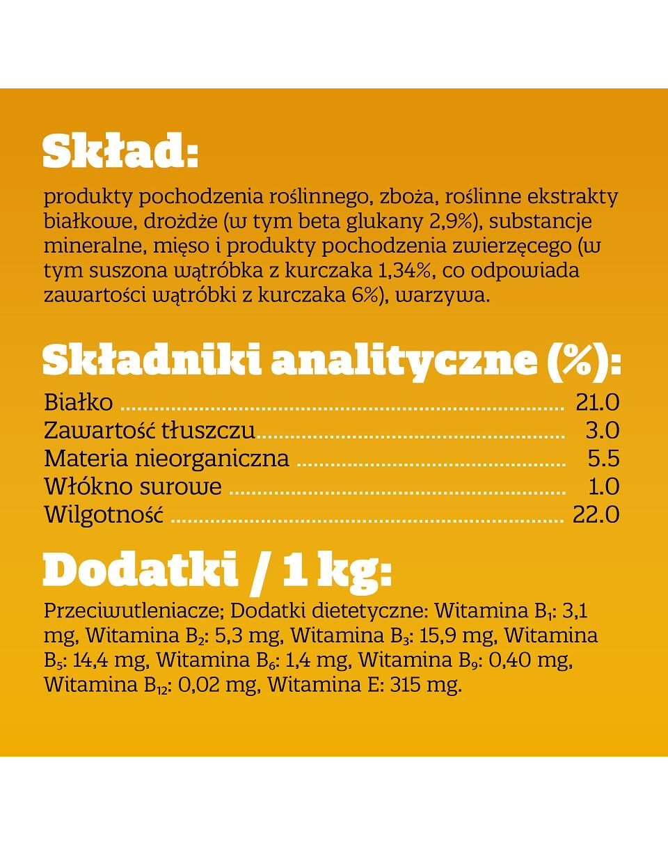 Composizione: prodotti di origine vegetale, cereali, estratti di proteine vegetali, lievito (compresi i beta-glucani 2,9%), minerali, carne e prodotti di origine animale (compreso il fegato di pollo essiccato 1,34%, corrispondente al fegato di pollo 6%), verdure.