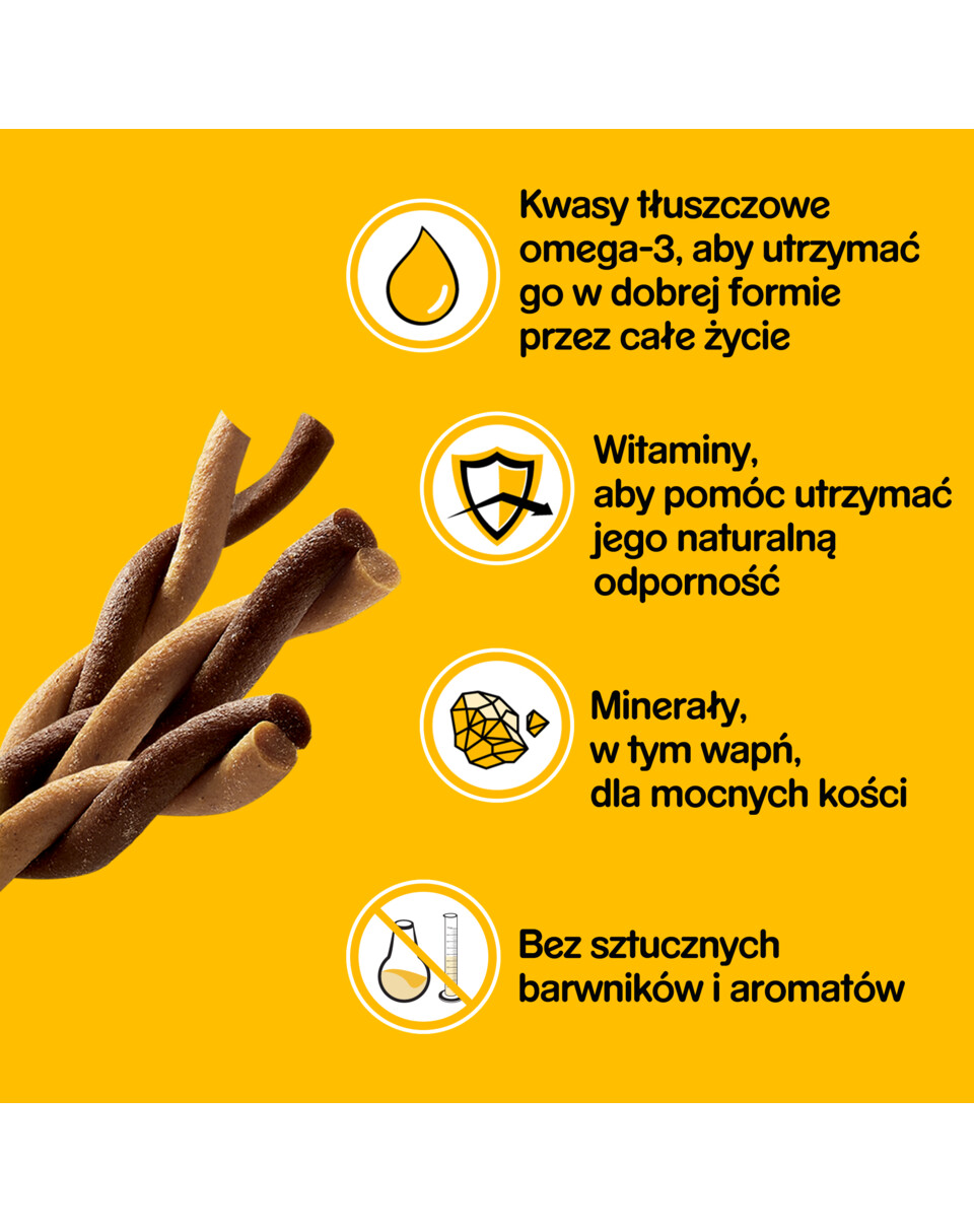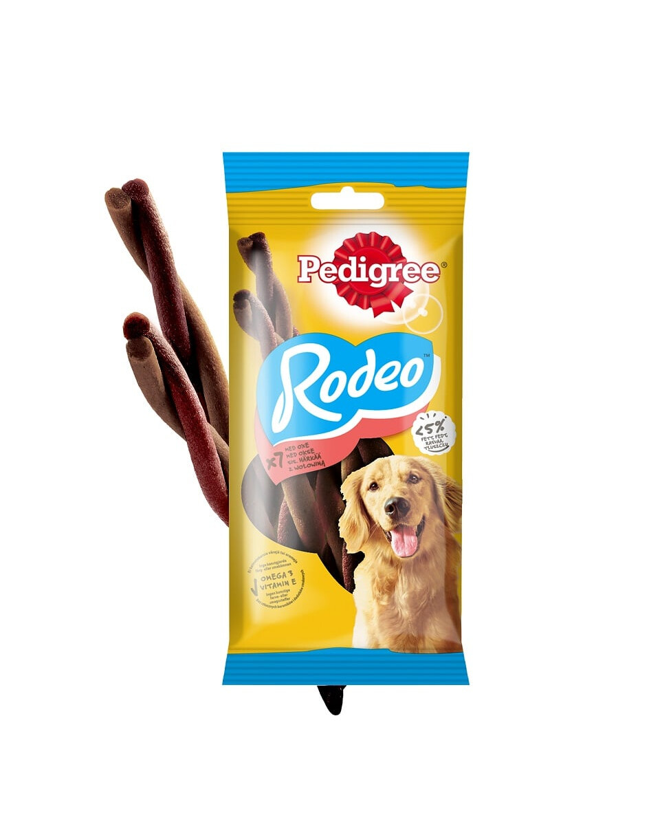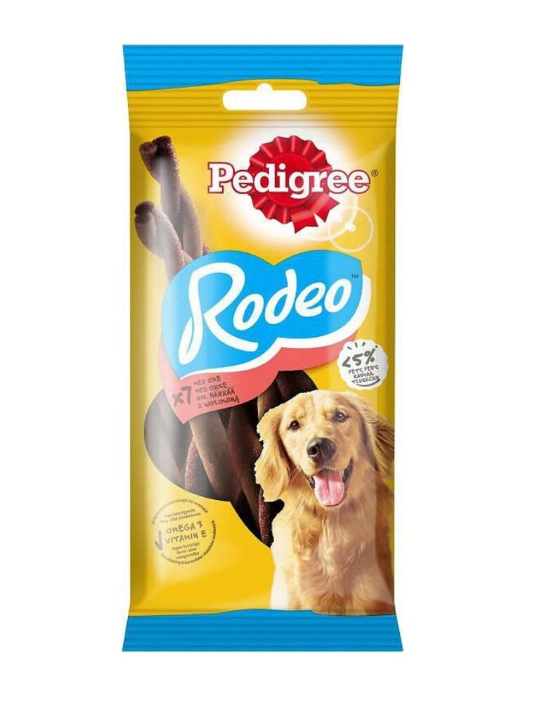 Per soddisfare il bisogno del tuo cane di masticare e mordere, scegli PEDIGREE Rodeo. Le molle flessibili di manzo sono perfette come spuntino gustoso che vi darà piacere. Questo delizioso bocconcino soddisfa il bisogno di mordere e masticare e offre al tuo cane qualcosa da fare. Questo alimento complementare non contiene coloranti o aromi artificiali. Lo spuntino contiene calcio, essenziale per mantenere denti sani e ossa forti. Un piacere naturale per il tuo amico a quattro zampe.