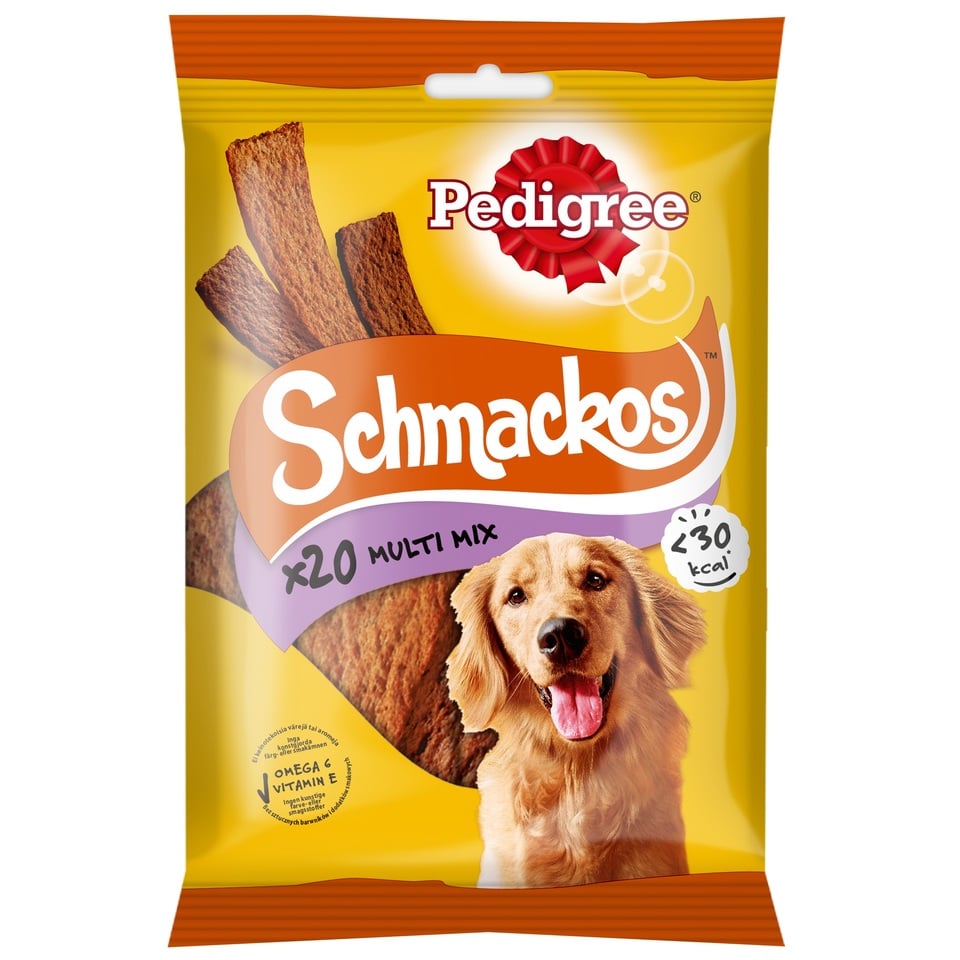 PEDIGREE Schmackos Multi Mix snack per cani in forma di strisce, facili da strappare in piccoli pezzi. Ottimi per le passeggiate, l'addestramento e i giochi con il cane a casa. I PEDIGREE Schmackos sono un'eccellente aggiunta alla dieta quotidiana del cane, fornendo nutrienti essenziali come le vitamine A ed E e il ferro. Questo bocconcino per cani è stato sviluppato con il coinvolgimento di veterinari ed esperti di nutrizione del Wellhow Institute of Animal Science. Questo bocconcino per cani non contiene coloranti o aromi artificiali. Meno di 30 calorie per barretta!