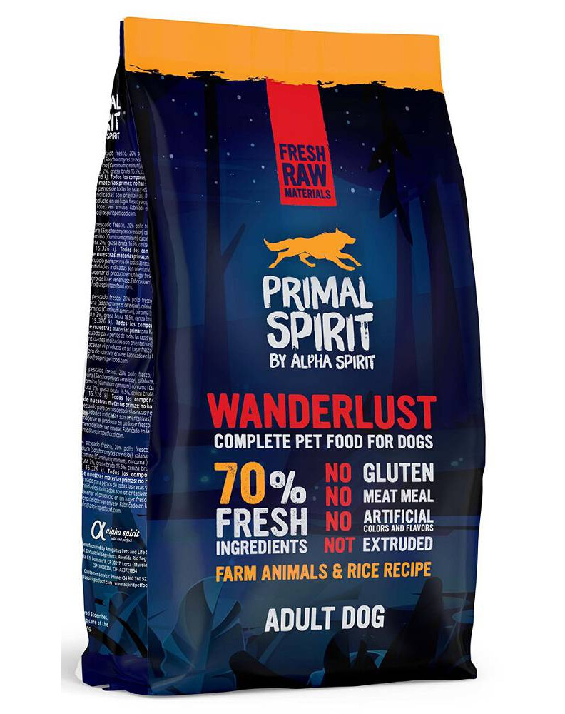 Primal Spirit Wanderlust è un alimento semi-morbido senza glutine per cani adulti con riso e pollo.
