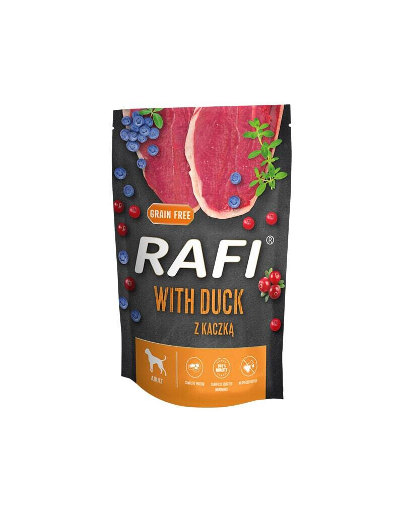 Gli ingredienti comprendono un'elevata percentuale di carne di anatra e di prodotti animali. Ciò significa che questo cibo umido fornisce una fonte proteica completa di tutti gli aminoacidi essenziali. Inoltre, è una fonte di aminoacidi (soprattutto di zolfo) e quindi non è necessario integrarlo con prodotti a base di cereali. Gli alimenti a base di anatra contengono le giuste proporzioni di selenio, rame e ferro per soddisfare il fabbisogno giornaliero di un cane adulto. Gli ingredienti particolarmente importanti della carne e del brodo d'anatra sono gli acidi grassi della famiglia n-6 e n-3, che regolano il sistema digestivo. L'aggiunta di timo aggiunge aroma e sapore al piatto e favorisce le funzioni digestive. I mirtilli proteggono l'organismo dai radicali liberi e i mirtilli rossi prevengono le infezioni del tratto urinario.