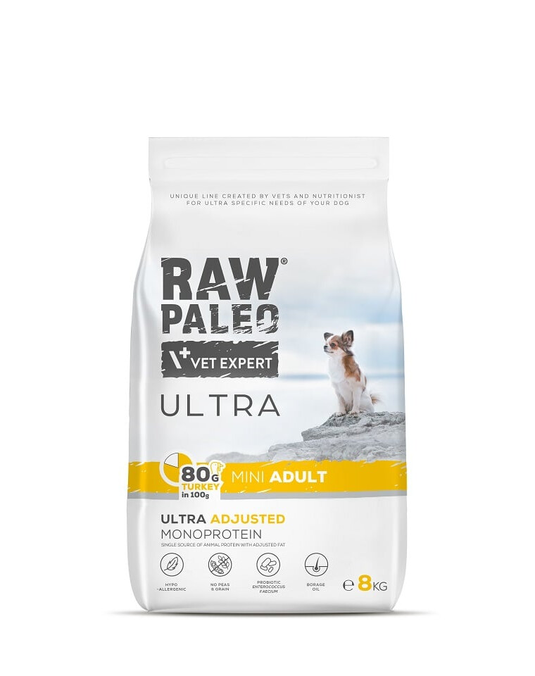Raw Paleo Ultra Mini Adult Turkey è un alimento completo per cani adulti (di età superiore a 1 anno) di razza piccola (peso corporeo inferiore a 8 kg). L'alimento è ipoallergenico e monoproteico.