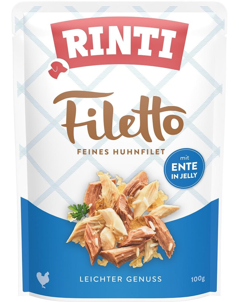 RINTI Filetto è un alimento complementare con pollo e anatra in gelatina aromatica per cani adulti di tutte le razze.