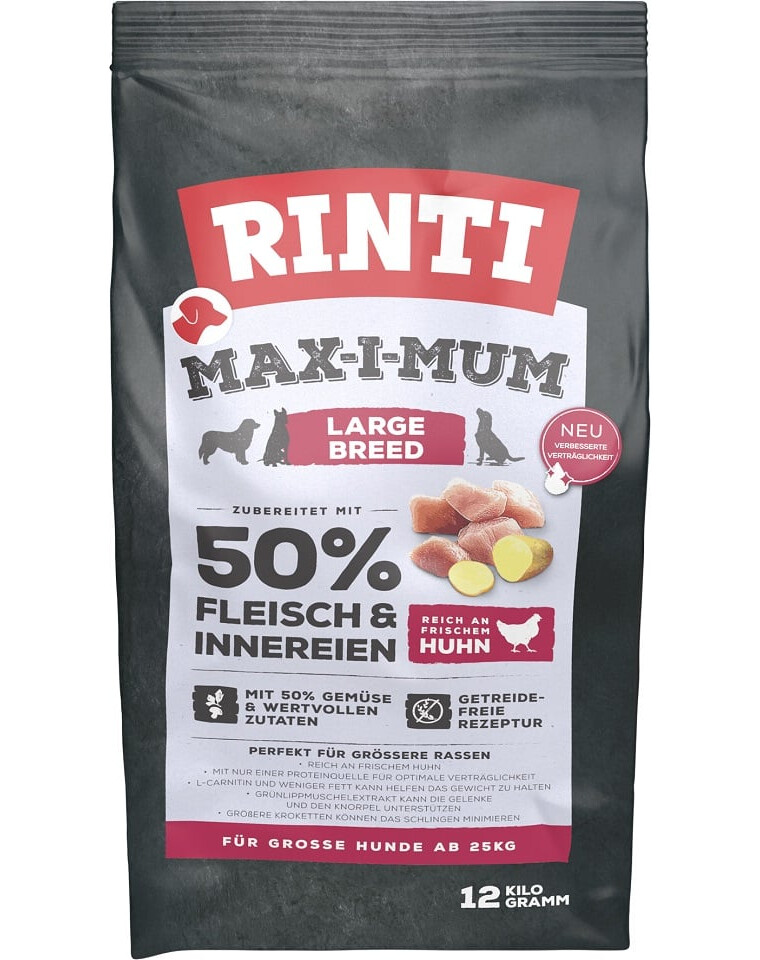 L'alimento Rinti Maximum Large Breed è stato sviluppato appositamente per cani di taglia grande con un peso minimo di 25 kg. Contiene il 50% di carne e frattaglie ed esclusivamente pollo monoproteico per gli stomaci sensibili dei cani di taglia grande. Più fibre per un controllo ottimale del peso e L-carnitina per favorire il metabolismo dei grassi. La glucosamina (contenuta nell'estratto di cozze dalle labbra verdi) contribuisce al mantenimento di cartilagini e articolazioni sane. Naturalmente privo di cereali, senza mais, glutine, soia, esaltatori di sapidità o additivi artificiali. Porzioni più grandi di cibo possono aiutare a ridurre le abbuffate. I cani sono carnivori per natura, quindi il cibo Rinti Max-i-Mum contiene grandi quantità di carne fresca, lavorata attraverso un complesso processo di produzione, ed è privo di cereali.