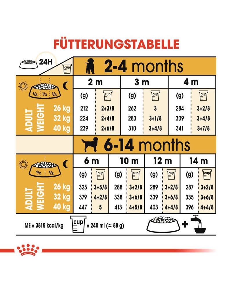 La forma, la dimensione, la consistenza e la formula delle crocchette sono adattate al cucciolo di Labrador Retriever.