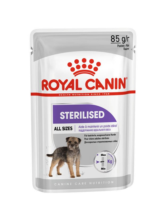 ROYAL CANIN® Sterilised Loaf è un cibo adatto a cani di tutte le taglie, che contiene ingredienti nutrizionali speciali che supportano la sensazione di sazietà del tuo cane, affinché rimanga snello e attivo.