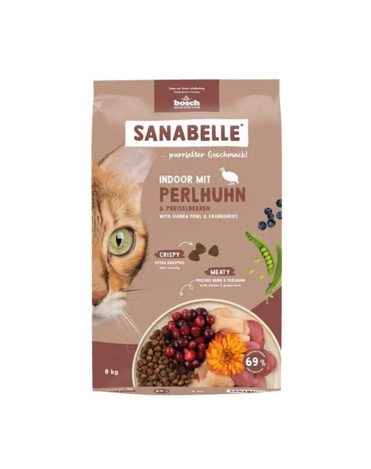 Sanabelle Indoor con Faraona è un alimento secco completo appositamente formulato per gatti che vivono in casa. La ricetta è stata adattata al loro ridotto fabbisogno energetico e alle loro abitudini specifiche, come una toelettatura frequente e una limitata attività fisica.