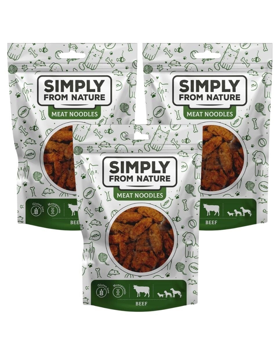 Simply from Nature Meat Noodles è un alimento complementare per cani. Da somministrare come spuntino, tra un pasto e l'altro. Si raccomanda di non sovralimentare il cane.