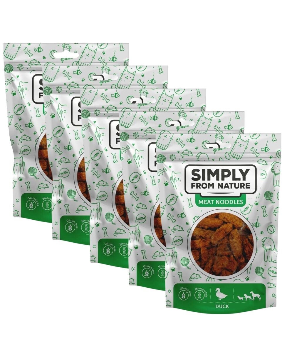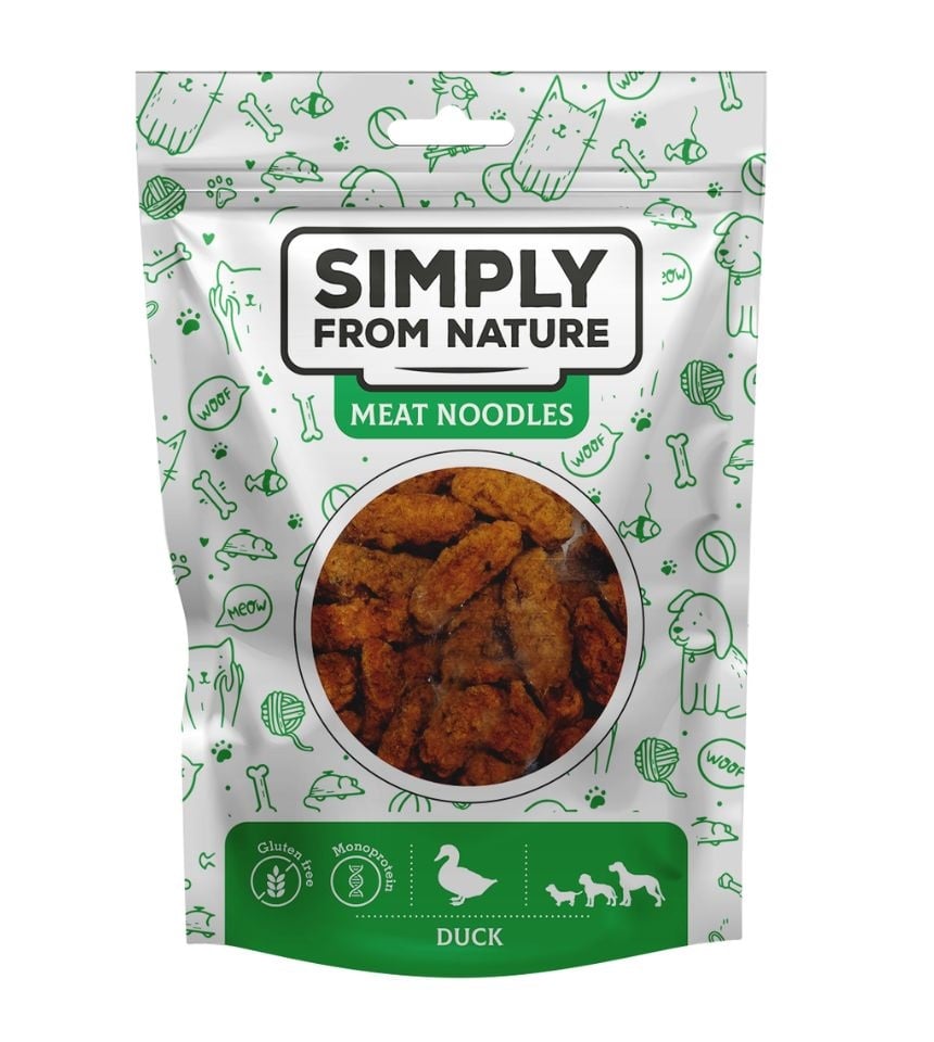 Le tagliatelle di carne Simply from Nature sono un alimento complementare per cani. Si consiglia di fare uno spuntino tra i pasti. Non sovralimentare il cane.