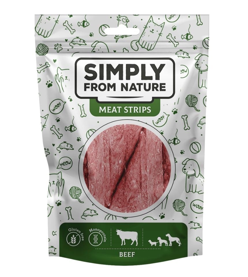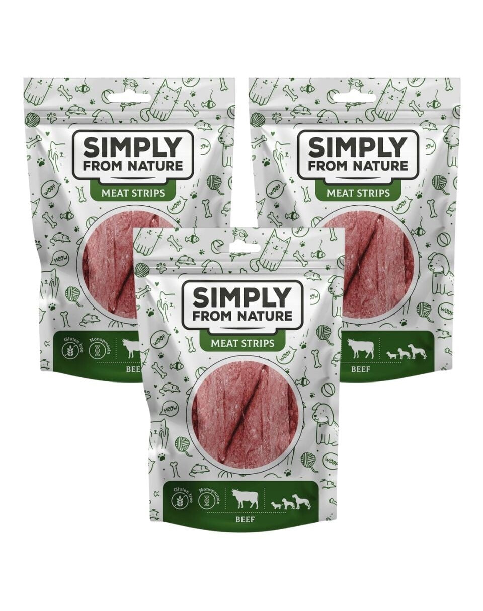 Uno snack sano e gustoso per i buongustai canini. Le strisce di carne essiccata per cani sono il complemento perfetto per la giornata del vostro animale. Nessuno dimenticherà il gusto delle strisce di carne di Simply from Nature.
