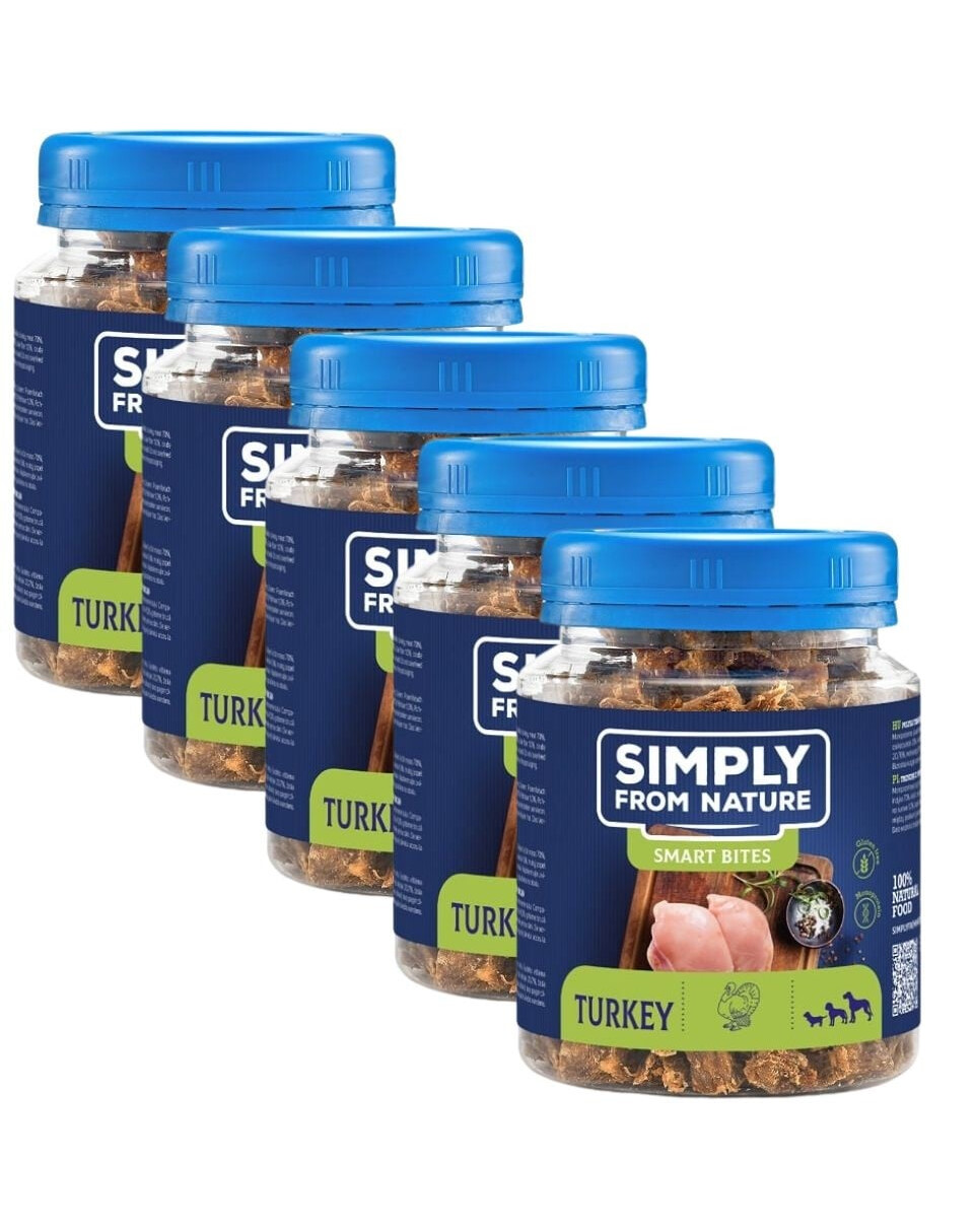 Il tacchino è una carne facilmente digeribile con un buon profilo aminoacidico ed è molto amato dagli animali domestici. Gli addestratori di tacchino hanno una forma ideale: sono piccoli, da dare in una sola volta non appena il cane ha completato il compito, facili e veloci da prendere e non sporcano le mani. Forniscono proteine e minerali per nutrire il cane e dargli energia durante l'addestramento. Il processo di essiccazione a cui viene sottoposto Smart Bites preserva il valore nutrizionale della carne utilizzata. I bocconcini non contengono aromi, coloranti o conservanti.