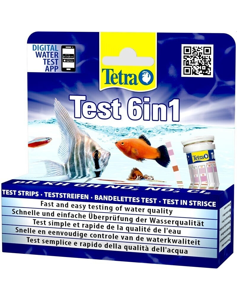 Le strisce reattive Tetra consentono di testare in modo rapido e semplice i sei parametri più importanti dell'acqua del laghetto in un unico passaggio: basta immergere la striscia nell'acqua e agitarla per uno o due secondi, quindi scuotere l'acqua e dopo 60 secondi leggere le informazioni sui parametri più importanti. Il risultato può essere confrontato con una tabella di colori per determinare quali valori rientrano in un intervallo di sicurezza. Misura il livello di pH, la durezza totale e carbonatica (GH + KH), il contenuto di nitriti (NO2-), nitrati (NO3-) e cloro (Cl2) dell'acqua dell'acquario. Gli organismi che vivono in acquario, come i pesci, reagiscono fortemente a variazioni eccessive del livello di pH, con conseguenze sul loro benessere. La durezza totale influisce sulle funzioni vitali dei pesci, mentre la durezza carbonatica influenza direttamente la stabilità del valore del pH (tampone del pH). Le strisce reattive misurano anche i livelli di nitriti e nitrati nell'acqua dell'acquario. Il nitrito è molto dannoso, anche in basse concentrazioni, e non dovrebbe essere presente nell'acqua in quantità rilevabili. I nitrati sono sostanze biogene che favoriscono la crescita delle piante. Tuttavia, livelli eccessivi di NO3- possono essere dannosi per i pesci e favorire una crescita eccessiva di alghe. Nell'acqua può essere presente anche il cloro, pericoloso per pesci e piante. Come nel caso dei nitriti, anche nell'acqua non deve essere presente cloro in quantità rilevabili. L'applicazione Tetra Aquatics può essere utilizzata anche per leggere in modo rapido e affidabile i parametri dell'acqua dal proprio smartphone.
