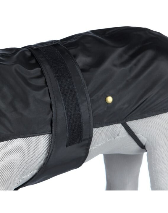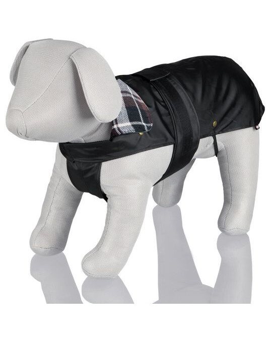 Realizzato in nylon resistente, protegge dal vento e dalla pioggia. Il cappotto è nero e il colletto è decorato con un elegante check. È dotato di chiusure in velcro sotto il collo e sulla pancia e di passanti per le zampe posteriori per mantenere il tutto aderente e antiscivolo. Un punto a favore del cappotto è la fodera di flanella rimovibile, fissata con bottoni automatici, che lo rende adatto sia alle giornate fredde che a quelle più calde.