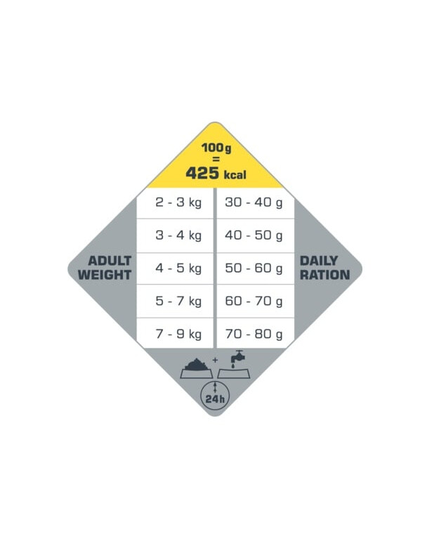 proteine 35,0% (*77,0% proteine di origine animale), contenuto di grassi 20,0%, ceneri grezze 9,5%, fibre grezze 3,0%, calcio 0,8%, fosforo 0,8%, magnesio 0,08%, taurina 2950 mg/kg