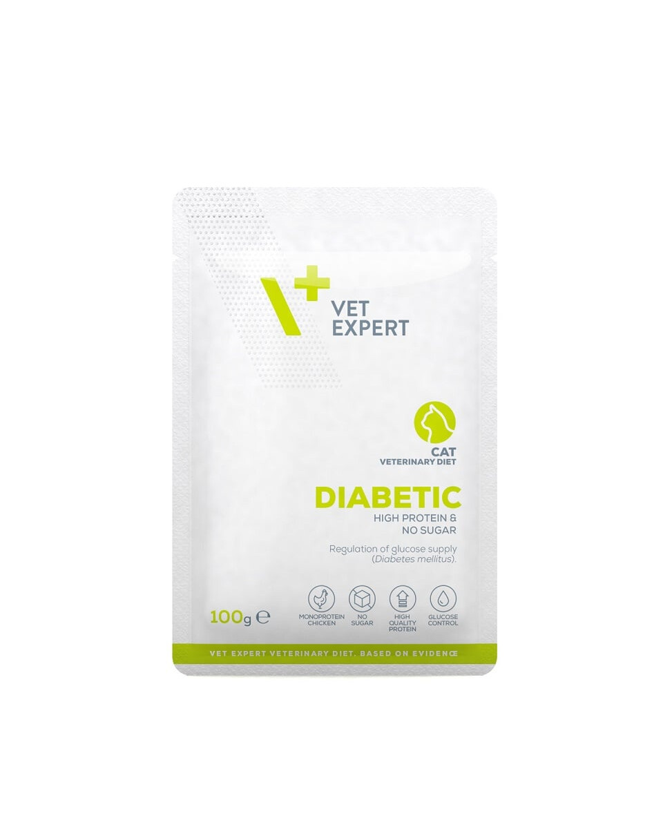 VET EXPERT Veterinary Diet Cat Diabetic è destinato ai gatti adulti affetti da diabete (diabete mellito). Questo alimento è a basso contenuto di zuccheri semplici, disaccaridi e amido per aiutare a regolare i livelli di zucchero nel sangue. Le proteine animali di alta qualità forniscono tutti gli aminoacidi di cui il gatto ha bisogno.