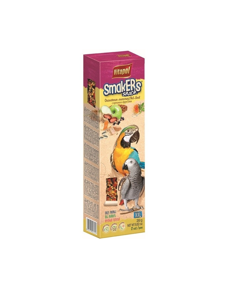 Smakers ricchi di molte vitamine, minerali e pectina derivati da frutta matura e di prima qualità come mela e sambuco. Le bacche di sambuco forniscono all'organismo carotenoidi e iodio, oltre a vitamina C, pectina, tannini e sali minerali. Le gustose noci integrano la dieta dei pappagalli con la vitamina E, che ha un effetto protettivo sul sistema nervoso e immunitario ed è un eccellente antiossidante. Inoltre, le noci sono una ricca fonte di magnesio.