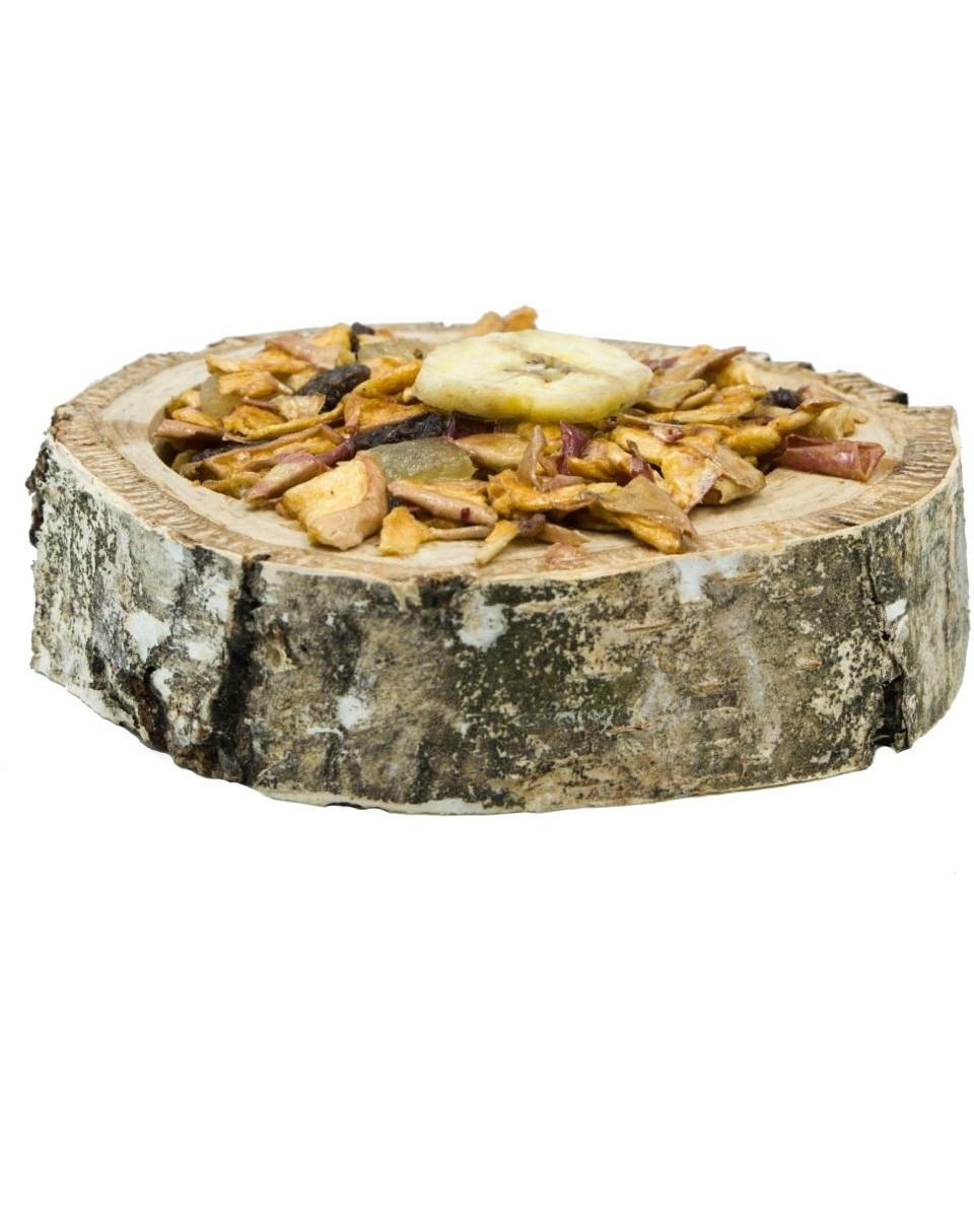 Fruttiera in betulla per roditori e conigli contenente un alimento complementare per aggiungere varietà al menu giornaliero. Può essere somministrato in aggiunta all'alimento di base o da solo. I frutti contenuti nella miscela sono una fonte di vitamine e minerali che hanno un effetto benefico sulle condizioni dell'animale.
