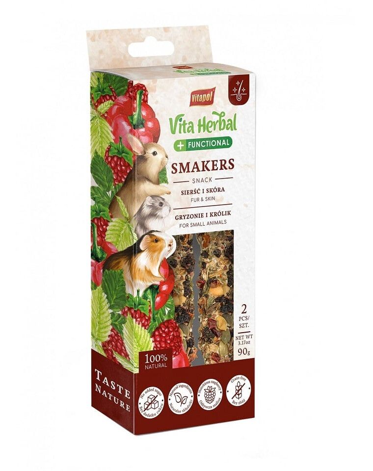 Gli Smakers funzionali Vita Herbal non sono solo una deliziosa leccornia, ma anche un prezioso integratore per aiutare il vostro animale a godere di un pelo sano e lucente e di buone condizioni della pelle. Scegliete questi bocconcini per aggiungere salute e gioia al menu quotidiano del vostro animale!