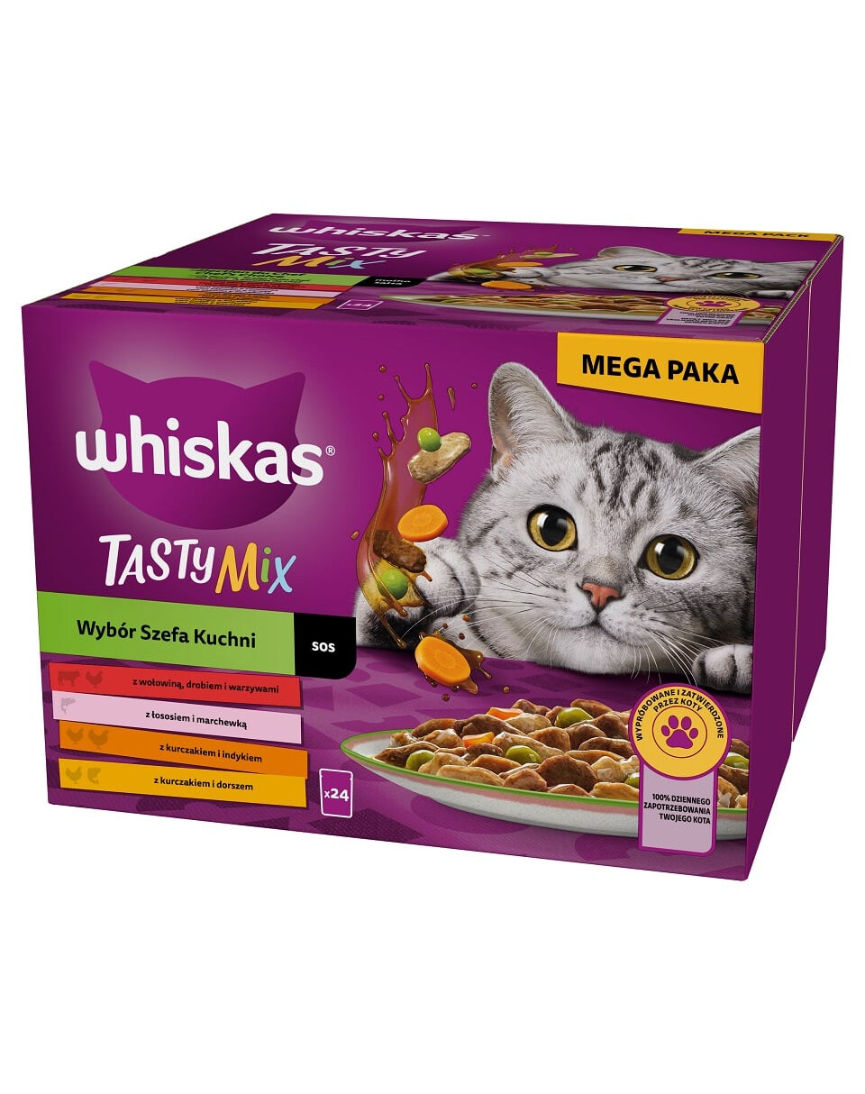 Whiskas Chef's Choice è un set di alimenti umidi per gatti adulti accuratamente preparati, completi e bilanciati. Il vostro amico felino potrà gustare uno dei quattro gusti (in combinazione con: Manzo, Pollame e Verdure, Salmone e Carote, Pollo e Tacchino, Pollo e Merluzzo). Ogni gusto contiene pesce succoso marinato in una salsa saporita. Una comoda bustina, studiata appositamente per le esigenze del vostro gatto, contiene zinco per favorire la salute della pelle e del mantello e il giusto equilibrio di minerali per aiutare a mantenere il tratto urinario del vostro animale Dai gattini agli splendidi gatti adulti, le nostre deliziose ricette sono state sviluppate con questo obiettivo, lasciando i gatti di tutte le età a fare le fusa con soddisfazione al momento del pasto e oltre.