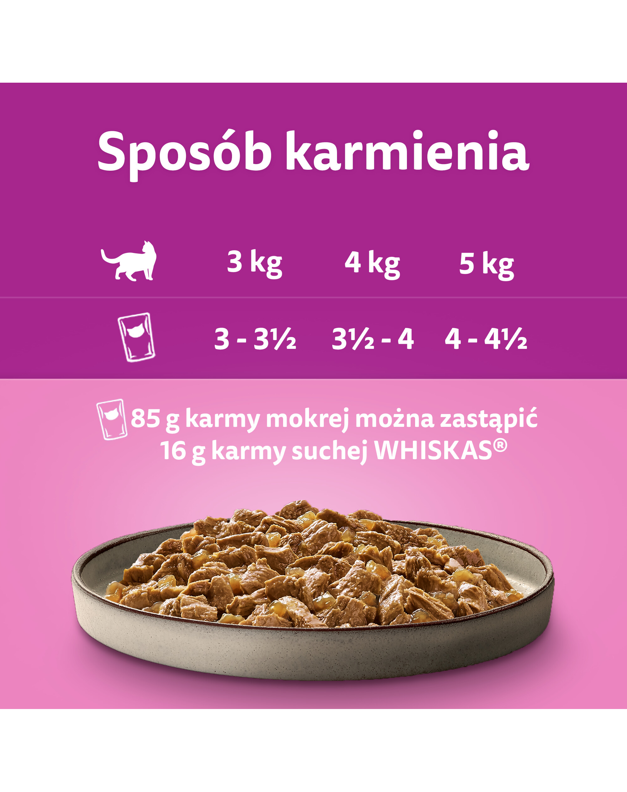 85 g di cibo umido possono essere sostituiti da 16 g di cibo secco WHISKAS.