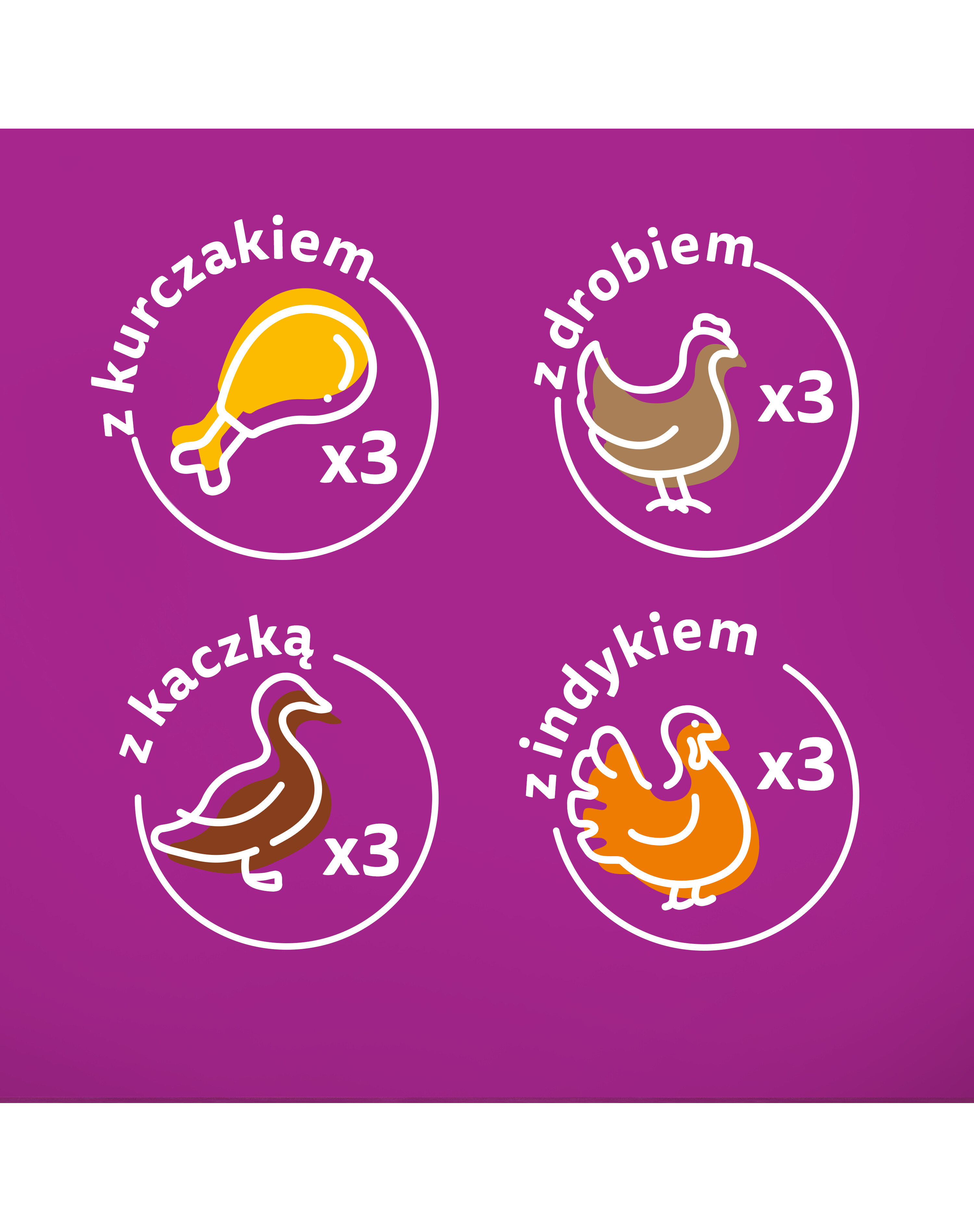I deliziosi bocconcini Whiskas sono preparati per mantenere il loro sapore naturale e il loro valore nutrizionale. La cottura a vapore li rende succosi e teneri, che faranno fare le fusa al vostro gatto. Il vostro amico felino si delizierà con una delle quattro varianti, pezzi con: pollo, tacchino, pollame, anatra. Gli alimenti Whiskas sono preparati con ingredienti naturali e proteine di alta qualità, senza l'uso di coloranti o conservanti artificiali, per un piacere alimentare eccezionale. Questi bocconcini teneri e facili da mangiare contengono zinco per sostenere la salute della pelle e del pelo, mentre il giusto equilibrio di minerali aiuta a prendersi cura del tratto urinario del vostro animale.