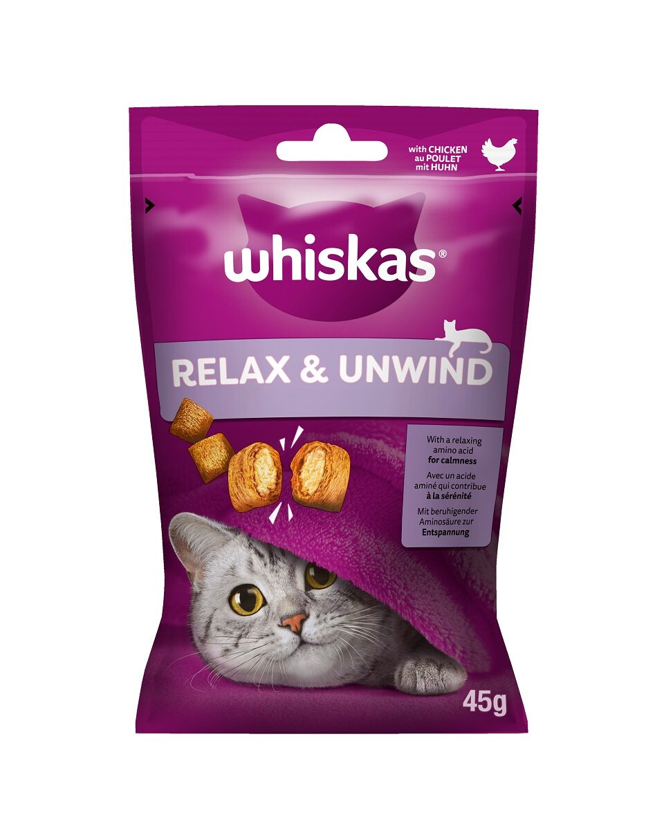 WHISKAS Relax & Undwind con pollo è uno snack delizioso e salutare sotto forma di croccanti bocconcini con un ripieno cremoso. La loro composizione è stata ulteriormente arricchita con vitamine e minerali. La ricetta contiene l'aminoacido triptofano, da cui si forma la serotonina, l'ormone della felicità e del relax. Con WHISKAS Relax & Undwind non solo darete al vostro gatto un grande piacere durante la giornata, ma soprattutto vi prenderete cura della sua salute. Il vostro gatto farà le fusa ancora di più!