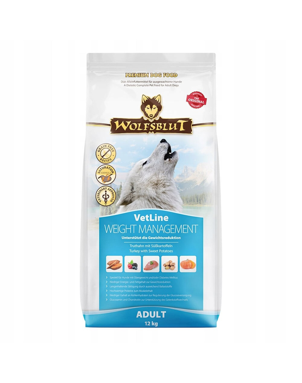 Wolfsblut VetLine WEIGHT MANAGEMENT è un alimento dietetico completo per cani adulti per ridurre l'obesità e regolare l'apporto di glucosio nel diabete. L'obesità nei cani si riconosce, ad esempio, dal fatto che accarezzando il cane non si sentono più le costole e il girovita non è più visibile. L'obesità può portare a diverse patologie, come le malattie cardiovascolari, i problemi articolari dovuti al sovraccarico, ma anche il diabete. È importante che l'organismo non cada in uno stato di carenza durante una dieta di riduzione e che i muscoli vengano preservati.