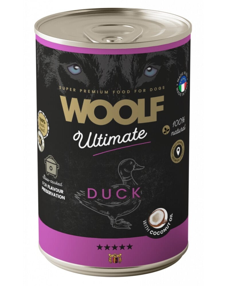 WOOLF Ultimate Adult Dog Duck and Coconut oil è un cibo umido completo e senza glutine sviluppato per cani adulti di tutte le razze. La ricetta si basa su carne d'anatra, che fornisce proteine di alta qualità biologica, e su olio di cocco – una fonte naturale di grassi sani che supportano il sistema immunitario, una corretta digestione e la salute della pelle e del pelo. Tutti gli ingredienti provengono da fornitori locali e sono sottoposti a un processo di cottura lenta a bassa temperatura, che consente di preservare il loro valore nutrizionale e il sapore unico. La consistenza morbida e umida rende il cibo ideale per cani schizzinosi, ed è anche perfetto da somministrare su un tappetino da leccare.